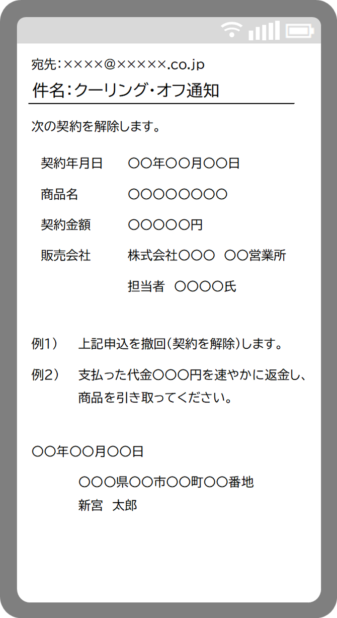 クーリング・オフは、電話ではなく内容証明郵便や はがき(コピーを取って簡易書留にする)など、必ず発進の記録が残る方法で行います。