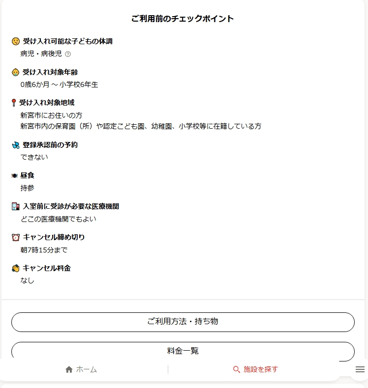 「今すぐ予約する」または「施設をさがす」から新宮市病児病後児保育施設「あんしんルーム」を選択し、「利用登録する」をタップします。